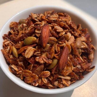 - Oats, Coconut Flakes, Almonds, Pumpkin Seeds, Sunflower Seeds, Chia or Flak Seeds, Cinnamon, nutmet, cardamom, ginger, and salt
